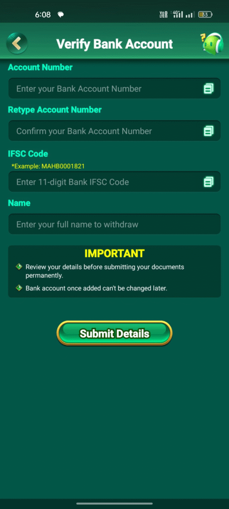 Lucky Bet Apk Login हेलो भाइयों अगर आप इस एप्लीकेशन में पैसा Arnig कर लिए हैं और उस पैसे को आप अपने बैंक अकाउंट में विद्रोह करना चाहते हैं तो उसके लिए आपको इसमें अपना बैंक अकाउंट इनफार्मेशन भरना होगा फिर आप जब अपना इनफॉरमेशन भर देंगे तब आपके अकाउंट आपके एप्लीकेशन में वेरीफाई हो जाएगा फिर आपको फिर आप एप्लीकेशन से पैसा विद्रोह कर सकते हैं |